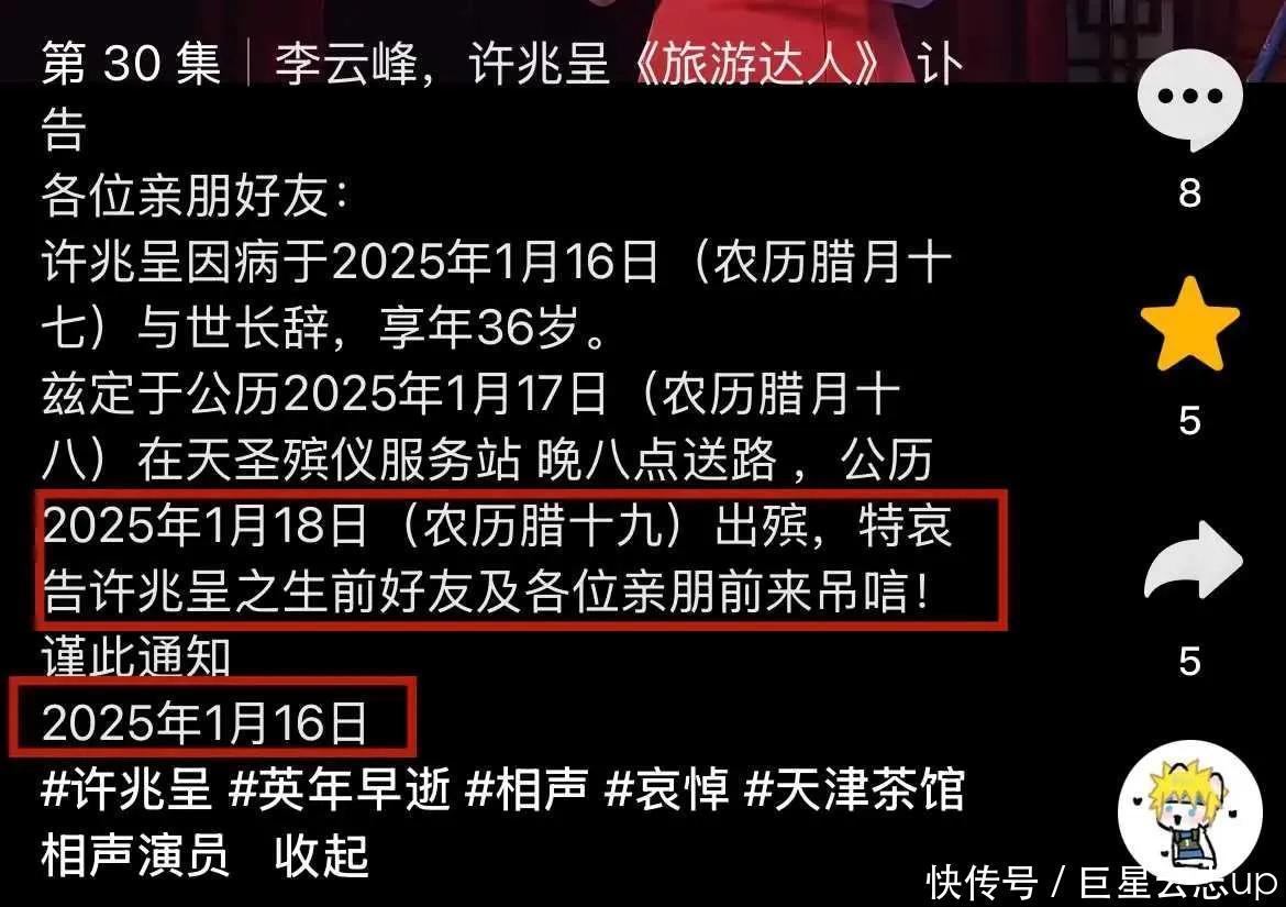 许兆呈死亡事情传开之后,搭档李云峰发布讣告,明确说明徐兆呈的死亡时间是2025年1月16日,去世原因是因病,最终年纪36岁。